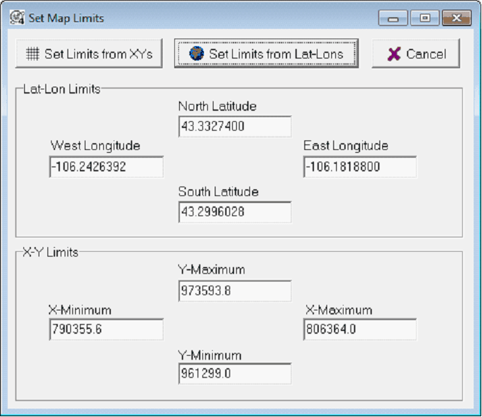 Data limits define the maximum aerial extent of the data that Petra keeps in memory and can display. Put another way, data limits define how far you can zoom out. Data limits can be set to automatically extend to cover the selected wells, the overlay, or an arbitrary area from XYs or Lat-Lons. To change the data limits, select Display>Data Limits>.... Auto Limits From Data - This option sets the data limits around the wells displayed on the Map Module. Note that this option isn't affected by disabled wells. This option is on by default, and is a great choice for most interpretation work. Selecting a different set of wells can change the extents of the map module. Set/Enter Limits - This option manually sets the map limits by either LatLons or XYs.