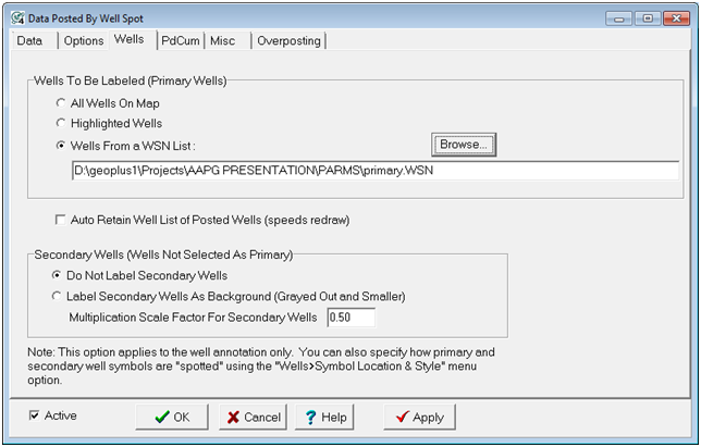 The Data Posting Wells tab limits the well data posting to only specific wells. This tab also sets up "Primary" and "Secondary" wells. "Primary" wells post well labels at full size, while "Secondary" wells either have their labels posted smaller and grey or skipped completely. To open the Data Posting tool, select the