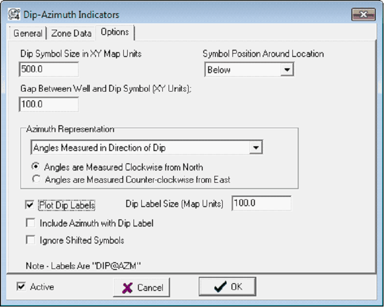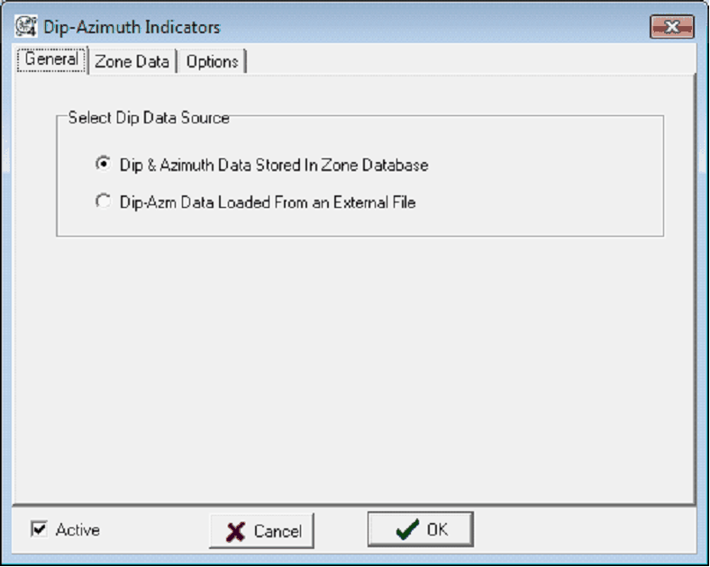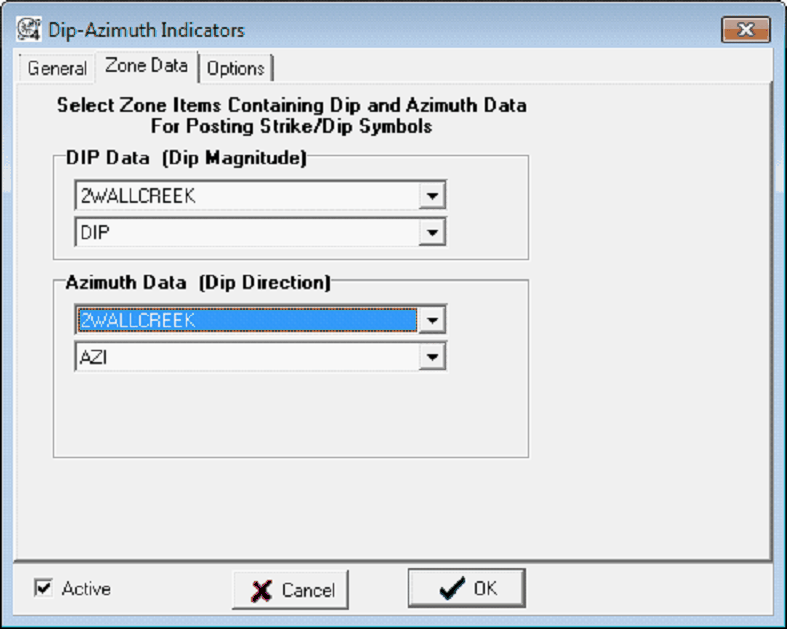 Dip DataThese two dropdowns set the location of the dip data item. The upper dropdown sets the zone, and the lower dropdown sets the specific data item. Azimuth DataThese two dropdowns set the location of the azimuth data item. The upper dropdown sets the zone, and the lower dropdown sets the specific data item. Options tab