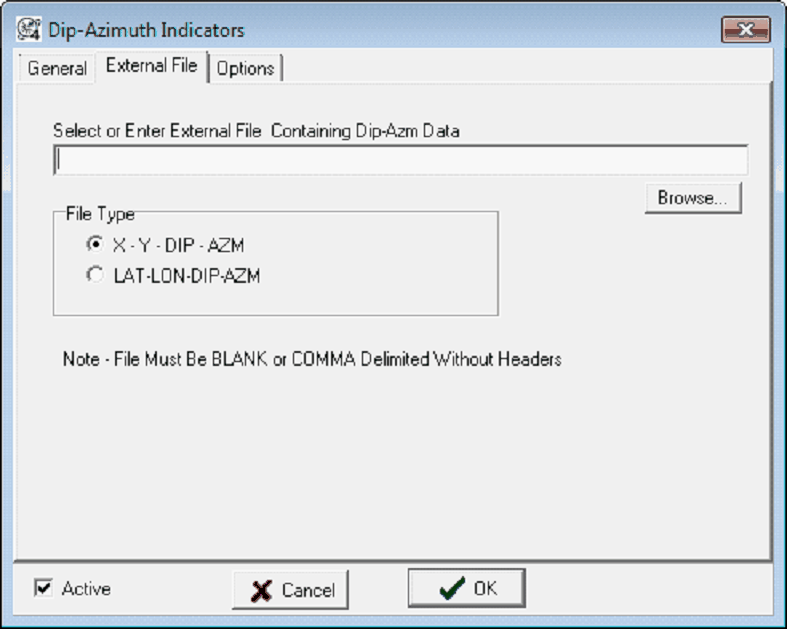 General tabThe General tab sets the data type for the dip and azimuth data. Petra can either use dip and azimuth data from a data item in the database or from an external file.