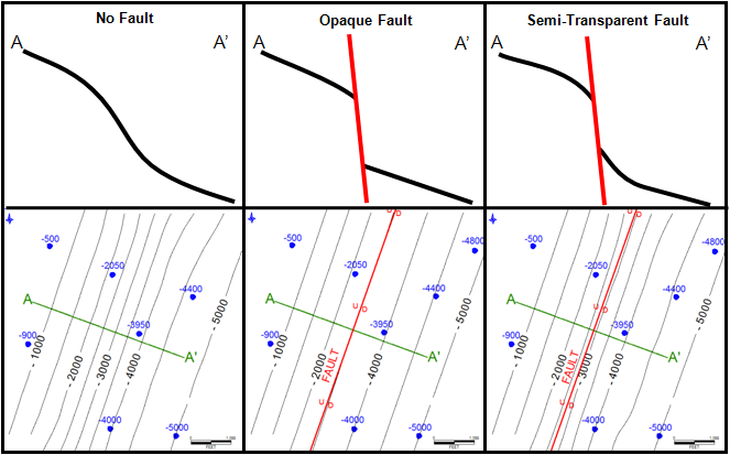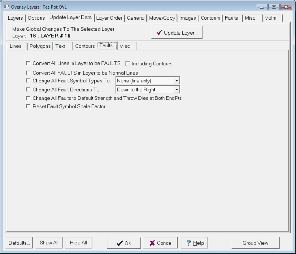 The Update Layers Faults tab Convert All Lines in Layer to FAULTS - By itself, this option converts "Normal Line" and "Unconformity Line" lines to "Fault Trace" lines. Including Contours This option also converts "Contour Line" line classes to "Fault Trace" lines. Convert All Faults in Layer to be Normal Lines - This option converts "Fault Trace" lines to "Normal Line" lines. Change All Fault Symbol Types to - This option changes the fault symbols of all "Fault Trace" lines in the selected layer. Available fault symbols include normal, reverse, vertical, or none. Importantly, these fault symbols are purely cosmetic and have no bearing on the gridding process. Change All Fault Directions To - This option changes how Petra draws fault symbols for all "Fault Trace" lines in the selected layer. "Down to the Left" and "Down to the Right" are relative to the starting point and the ending point. A rule of thumb is to assume you are standing on the start point and looking out towards the first segment - what is on your left is left, and what is on your right is right. Importantly, these fault symbols are purely cosmetic and have no bearing on the gridding process are purely cosmetic and have no bearing on the gridding process. Change All Faults to Default Strength and Throw Dies at both EndPts - This option restores all faults in the overlay layer to the default "semi-transparent" strength. At this default strength, Petra's gridding allows the grid to flex a little across the fault, rather than be completely unchanged by a transparent fault or completely broken by a opaque fault.