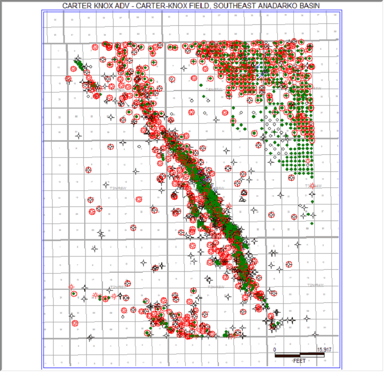 The Highlight Wells tools quickly distinguishes between different sets of wells with a colored circle. This tool can distinguish wells based on data criteria, wells selected on the cross-section Module, or wells selected on the Cross Plot Module. This tool is available under Wells>Highlight Wells>... To change the well highlight color, change the "Well Map Highlight" option under Display>Colors.