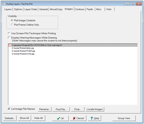 The Overlay Layers' Images tab VisibilityPlot Image Contents - This option plots images on the Map Module. Plot Frame Outline Only - Large aerial or satellite image files can use a large amount of computer resources and network bandwidth. This option plots a frame outline of the image extents rather than the image itself.