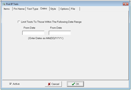 The Items tab sets the specific entries on the Map Module. To open the IP Tests tool, select Options>Post IP Tests. To open the Post Formation Tests tool, select Options>Post DSTs.