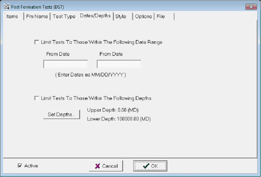 Limit Tests to Those Within The Following Date Range - This option enables a date restriction for the tests plotted on the Map Module. Tests not inside this range will not plot on the Map Module. From/To Date - These two entry boxes set the start and end dates in MM/DD/YYYY. Limit Wells to Those Within the Following Depths (DST Only) - This option enables a depth restriction to the DSTs plotted. Only DSTS within a specified depth range will plot on the Map Module. Set Depths (DST Only) - This opens the Set Depth Range tool that limits the tests to those within a depth range set by formation tops, a constant depth range (in MD, TVD), or a zone's interval definition.