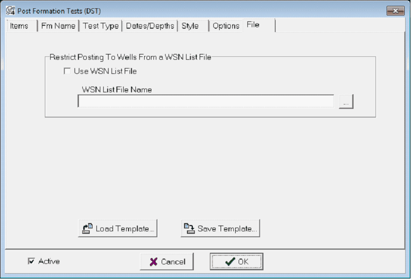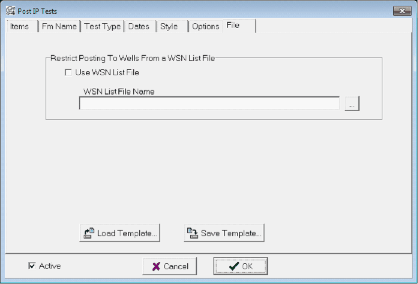 The File tab restricts the tests posted on the Map Module to only those wells listed in a WSN file, and saves the tool settings to an external file. To open the IP Tests tool, select Options>Post IP Tests. To open the Post Formation Tests tool, select Options>Post DSTs.