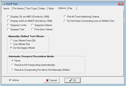Do Not Draw Connecting Line on Shifted Text - By default, Petra draws a dotted line between the well symbol and shifted IP/DST text boxes.  This option disables the line between the two.   This can declutter the map, but might make it difficult to connect a test to a specific well - particularly with wells with large offsets.