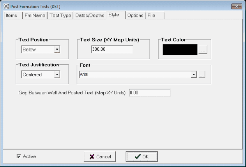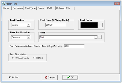 Text Position - This option sets the location of the text relative to the well symbol. Text Size - This option sets the text size. The Post IP tool can post data in either XY units or inches, while the Post Formation Tests Tool can only post in XY units. Text Color - This option sets the text color. Select the box or the "..." button to open the color dialog.
