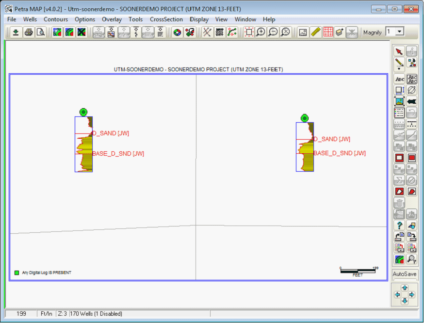 The Plot Log Curves Beneath Wells tool controls how Petra displays log curves underneath well symbols on the Map Module.