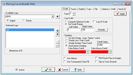 Set Scale Range - This option sets a fixed left and right scale for the log curve. The "Defaults" button calculates a scale range that is 2 standard deviations around the mean using the first 20 wells with data.