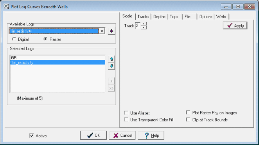 The Plot Log Curves Beneath Wells Scale tab (Raster Log Selected)
