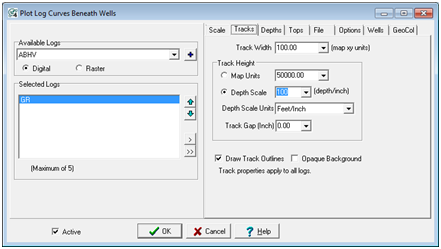 The Tracks section applies to all logs plotted and contains options for setting the track width, height, and scale. The track dimensions define a rectangle in which each log is plotted.