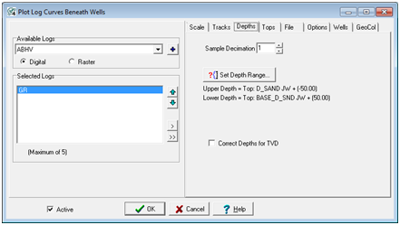 The Depths section shows the depth range over which the log curves will be displayed.