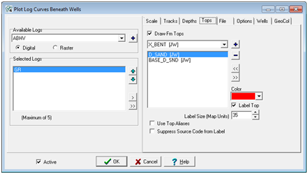 Draw Fm Tops - This option enables or disables the formation tops on the log curve plot. Disabling this option turns the tops off, but retains the settings.