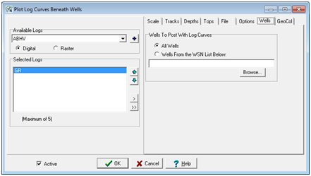 The Wells tab can limit the wells displaying logs to only those wells on a WSN list. Wells not on the list will not display log cuves.