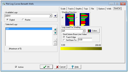 GeoColumn Shading - This option enables the geocolumn shading, which fills the space under the log curve based on a log curve's values. Selecting this option enables the GeoCol tab on the far right side of the Plot Log Curves Beneath Wells Tool. The GeoCol tab controls the specifics of how Petra uses geocolumn shading.