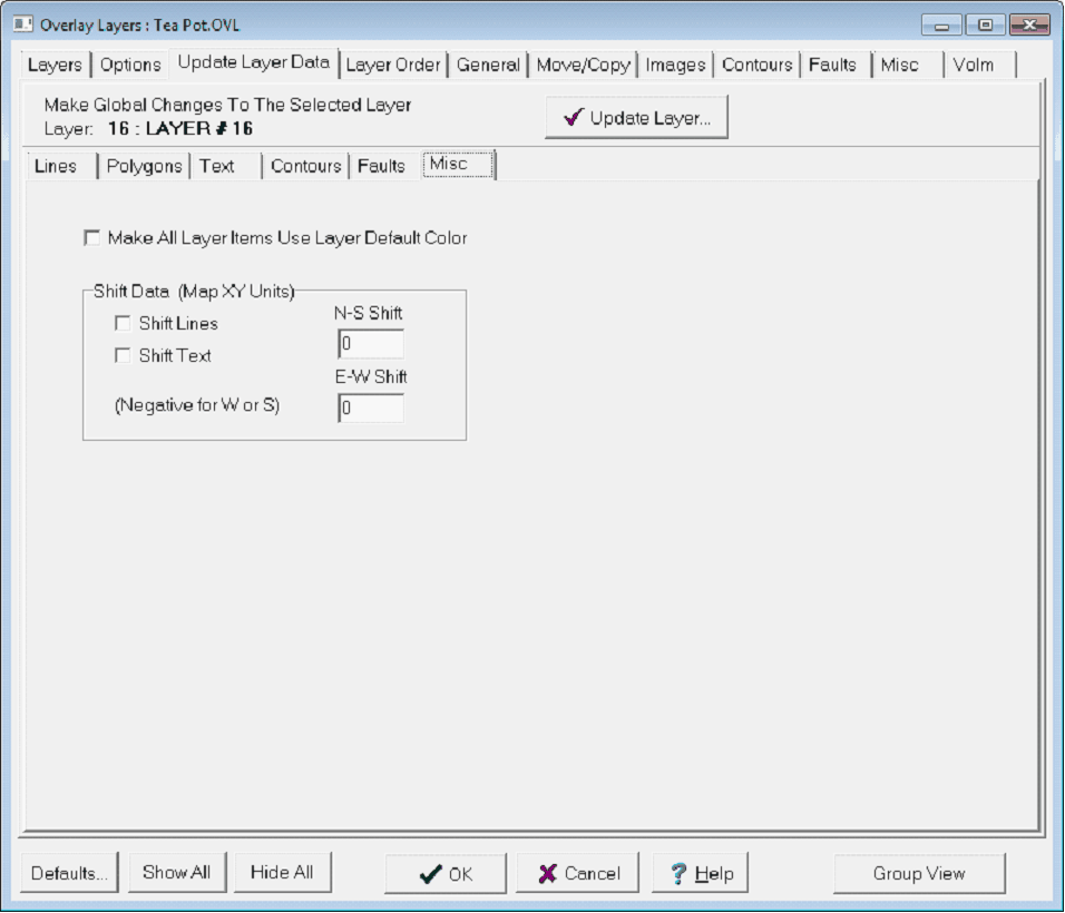 Make All Layer Items Use Layer Default Color - This option resets all items in the selected overlay layer to use the default color set on the Layers tab. Shift DataThis tool moves every overlay object in the selected layer. DX and DY - This tool shifts the line or polygon a set number of map XY units. For DX, positive numbers are east and negative numbers are west. For DY, positive numbers are north and negative numbers are south. Distance and Angle - This tool shifts the line or polygon a set number of map XY units in a compass direction. The Distance is in map XY units, and the angle is in compass values (E=0, N=90, W=180, and S-270). This tool does not rotate the item. |