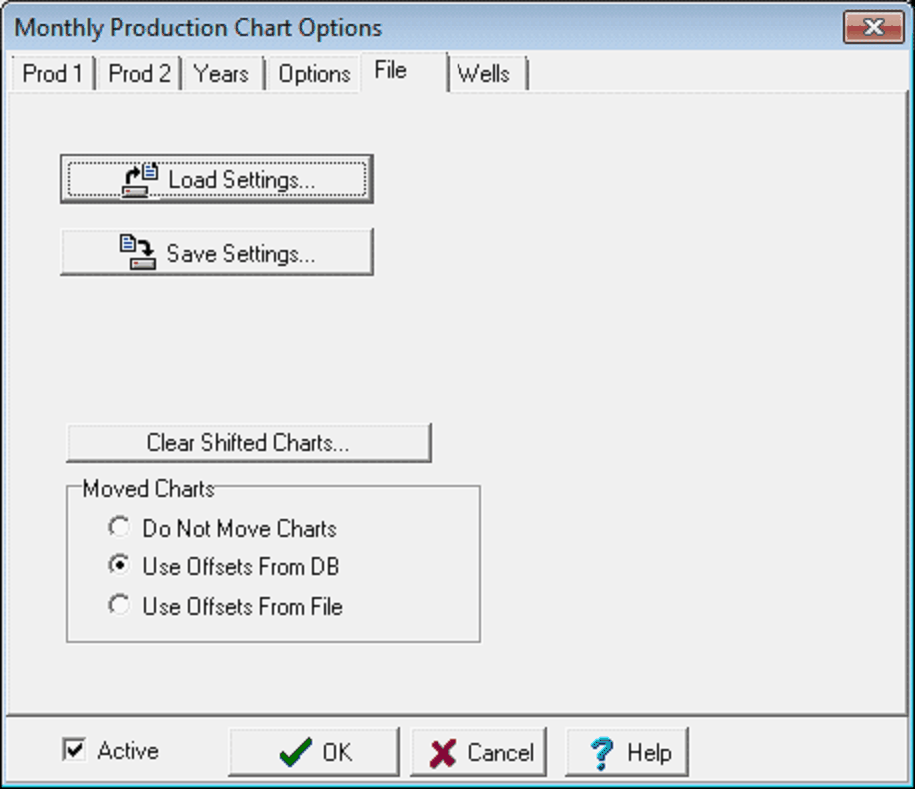 The File tab saves and restores Monthly Production settings and globally changes the positioning if production charts Load Settings - This button loads previously saved production plot settings from a *PMO file. Save Settings - This button saves the production plot settings to a *PMO file. Clear Shifted Charts - This option resets all shifted charts back to the default position. Moved ChartsDo Not Move Charts - This option overrides any manually shifted charts, and draws them back at the default position. Note that the positions are still saved in the DB and can be restored by selecting a different option. Use Offsets from DB - This option uses the manually selected positions of the production charts. Use Offsets from File - This option uses the currently selected file in the Data Offsets File Manager. |