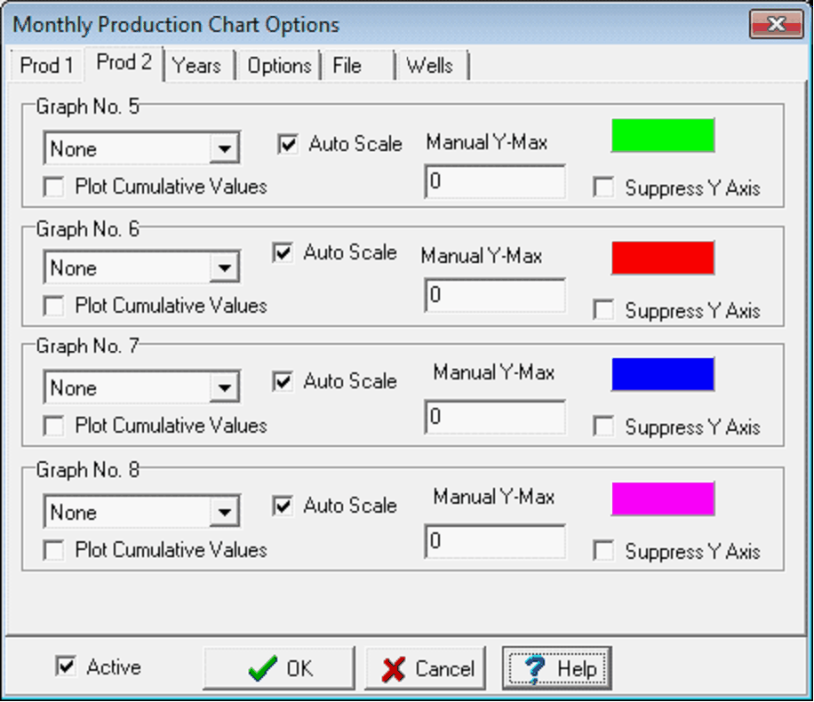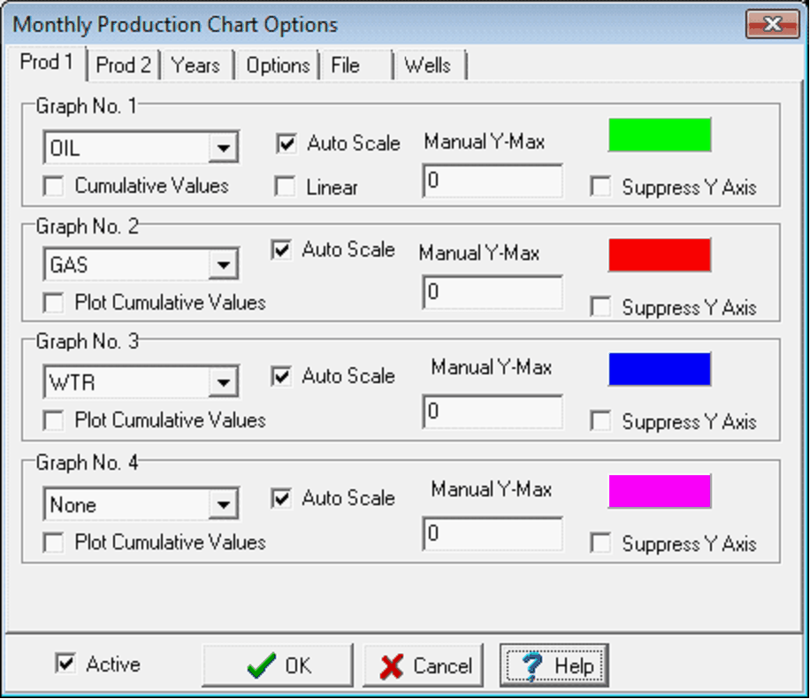 The Prod 1 and Prod 2 tabs set the production data shown on the production chart. Production Stream - This dropdown selects the individual production stream. By default, the OIL, GAS, and WATER and water streams are set in green, red, and blue. Select "None" to disable the graph. Cumulative Values - This option displays cumulative values for the selected stream at the bottom of the plot. Auto Scale - This option automatically scales the selected production stream to use the desired logarithmic decades set on the Options tab. Linear - By default, Petra plots production values on a logarithmic scale. This option forces Petra to instead use a linear scale. Manual Y-Max - This entry specifies a maximum for the selected production stream. Values above this plot will be off the top of the chart. Note that the minimum will be determined by the number of log cycles. Color Box - This bar sets the color of the stream on the plot. To change the color, select the color box, and select a new color on the