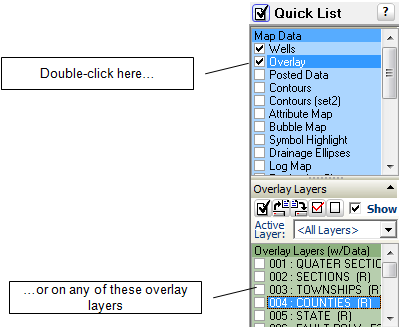 Map Overlay Overlay toolsThe Overlay Layers tool enables and disables individual layers, sets the layer plotting order, and performs other high-level changes to the currently loaded overlay file. To open the Overlay Layers Tool, select Overlay>Preferences & Layers from the menu bar at the top of the Map Module. Alternatively , double-click "Overlay" on the Map Data part of the Quick List, or double-click a single layer on the Overlay Layers section of the Quick List.