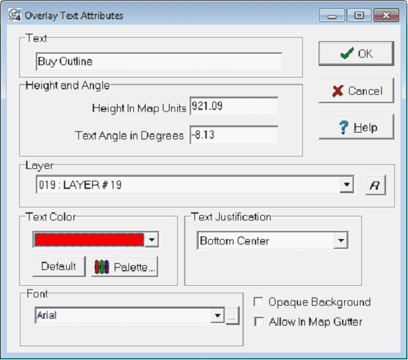 Text Angle - This entry sets the angle of the text box. Note that entry will reflect how the text box was drawn on the Map Module. Flat is 0 degrees.
