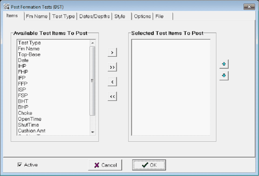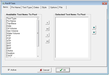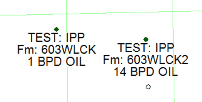 Petra can easily post IP and formation test information on the Map Module. Note that these IP and formation tests are in separate tools, but the two tools are very similar and work in almost the same way. To open the IP Tests tool, select Options>Post IP Tests. To open the Post Formation Tests tool, select Options>Post DSTs.