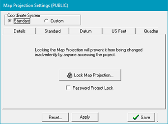 The Lock tab prevents any changes from being made to the Petra project's map projection. This lock can also be password protected. Locking the map projection saves the currently selected map projection, so be sure to have the correct map projection selected before locking the project.
