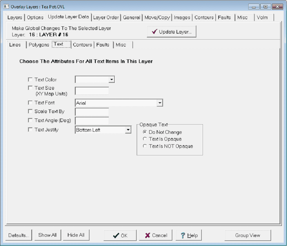 The Update Layers Text tab Text Color - This dropdown sets the color of the text. To change the available colors on this dropdown, select the "Palette..." button. To restore the default colors, select the "Default" button. Text Size - This entry sets the height of the text in XY map units. Since the height is specified in a map scale, the text will enlarge as you zoom in and out of the map. Text Font - This option sets the text font. Scale Text By - This option changes all the text in the specified layer by a scale factor. Setting this option to 0.5 will decrease the text by 50%, for example. Text Angle - This entry sets the angle of the text box. Note that entry will reflect how the text box was drawn on the Map Module. Flat is 0 degrees. Text Justify - Text justification can be set to a combination of Top/Middle/Bottom and Left/Center/Right. Opaque Text - This option sets how Petra handles text overlapping other elements in the Map Module. Opaque text will cover up underlying data. |