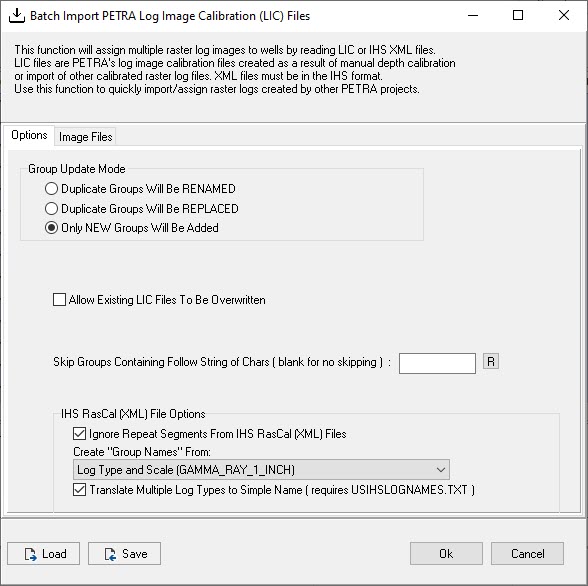This function will assign multiple raster log images to wells by reading LIC or IHS XML files. XML files must be in the IHS format. Use this function to quickly import/assign raster logs created by other PETRA projects.