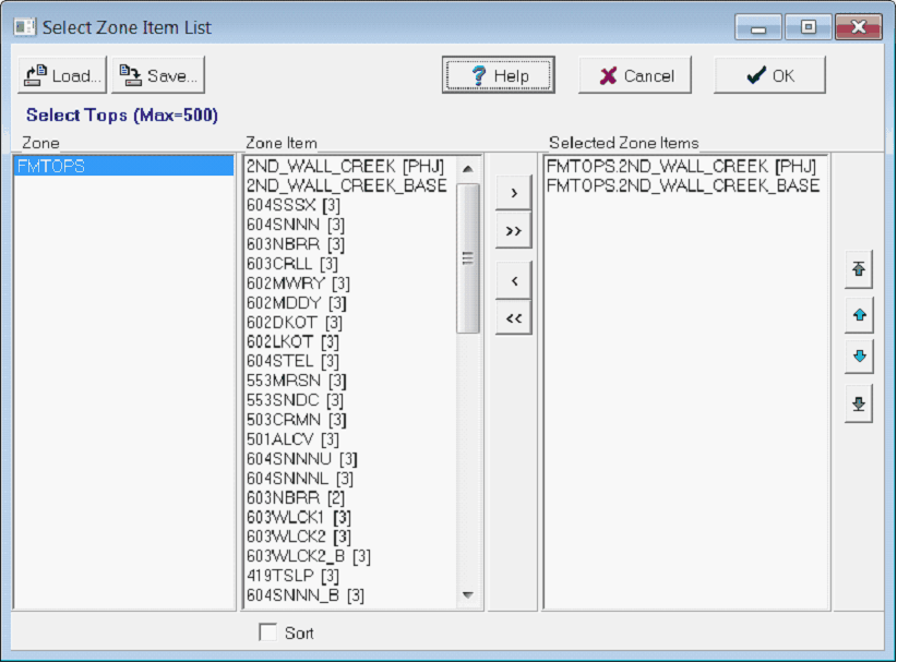 The first step to working with tops in the Slip Logs Module is to select the tops to display. A project can contain hundreds of tops, so this tool can be useful for filtering the list down to only the most relevant formation tops. To select the tops to display on the Slip Log Module, select Tops>Select Tops to open the Select Zone Item List tool.