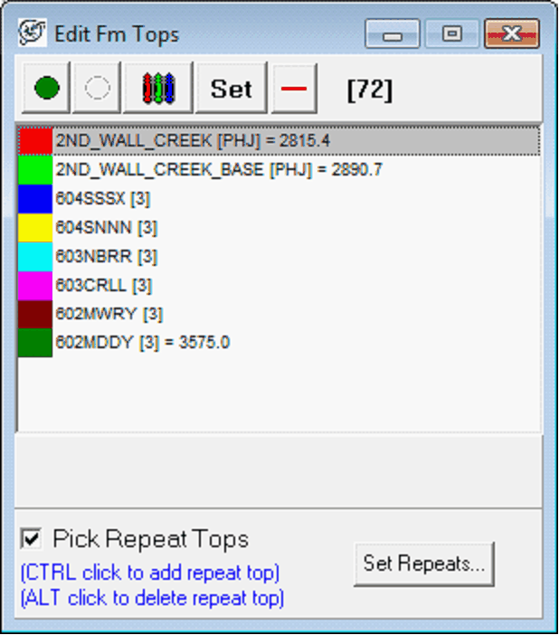 Select the desired tops on the by selecting formation top names from the "Available Items" list and adding them to the rightmost "Selected Items" list. To add one or more selected item names, highlight the names and click the ">" button. You may add all items from the "available" list by clicking the ">>" button. Items may also be added by double clicking the name in "available" list. To remove a top from the the "selected" list, highlight the desired top and select the "<" button. To clear all tops from the list, select the "<<" button. Editing TopsOnce tops are displayed on the Slip Log Module, select Tops>Show Tops on the menu bar at the top of the screen or select the