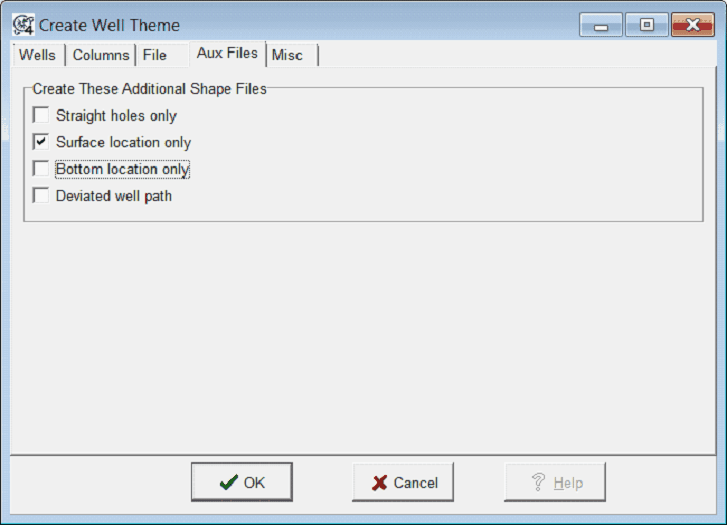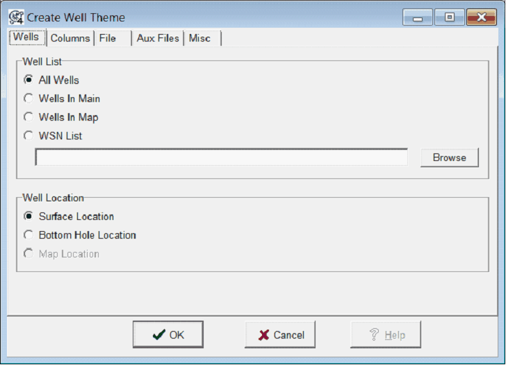 By default, the Create Well Theme tool creates well themes for all wells. This tab creates additional well themes based on specific well types, including straight wells, surface locations, bottom locations, or the wellpaths of deviated wells.