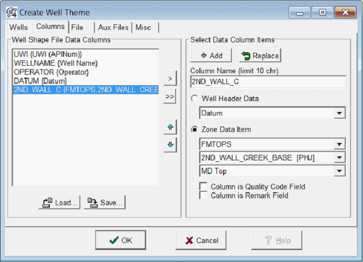 Replace - This button will replace the selected item on the "Well Shape File Data Columns" list with the well header or zone item data. Data on this list will be included in the well shape file.