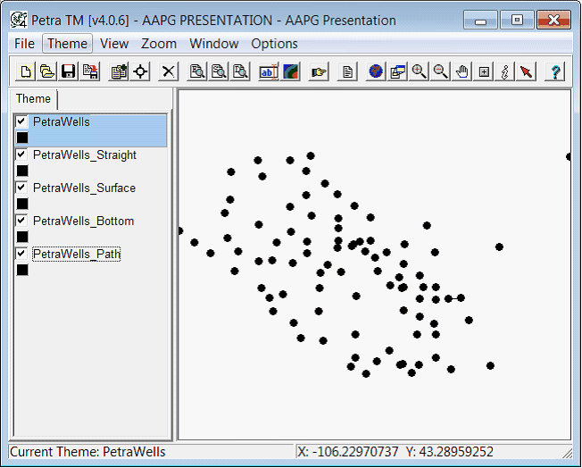 A "well theme" is a shape file that is created and populated with well data from the Petra project database. Like any other shape file, you can run queries on a well themes attributes - a well theme will contain well data pulled from the Petra project.