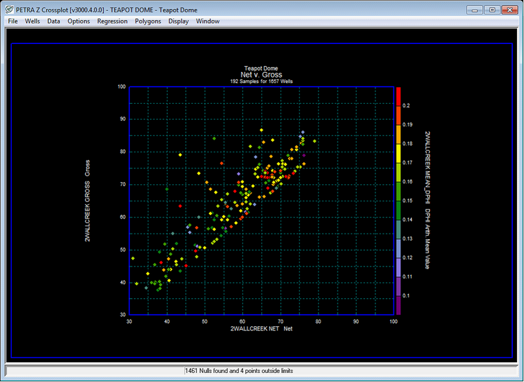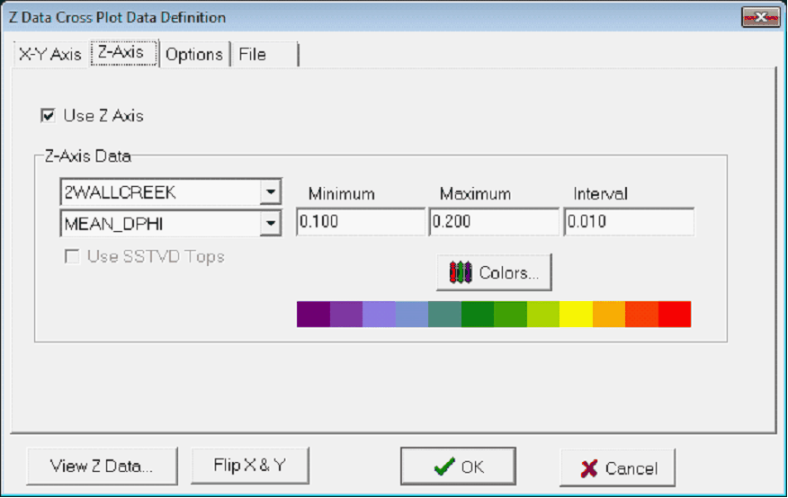 Z Axis DataThis section sets the specific zone and data item, for the Z axis color coding. The upper dropdown select the zone, and the lower dropdown selects the data item. Minimum (left) - This entry sets the minimum value for the cross plot. Maximum (right) - This entry sets the maximum value for the cross plot. The normal Color bar is Petras default way of selecting the colors for a grid. This system gives greater flexibility in changing colors and irregularly spaced intervals, but tends to be a little more work to set up and has a more limited total number of intervals.