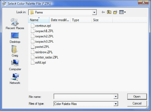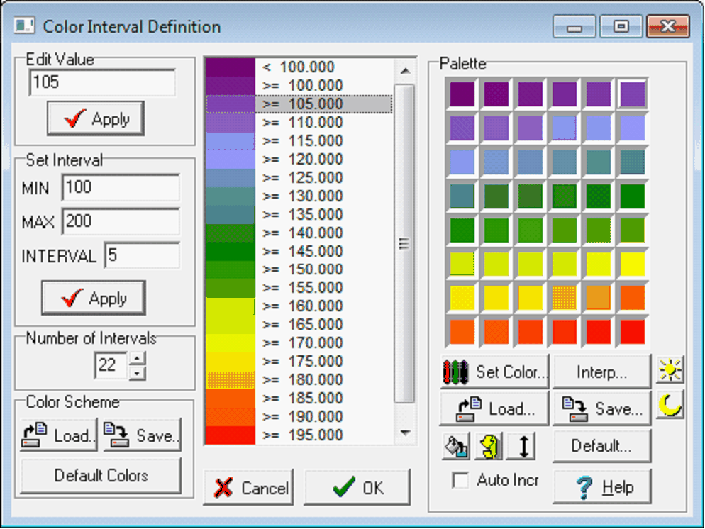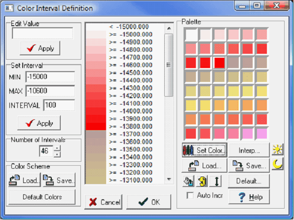 Color SchemeLoad... - This button loads a previously saved set of intervals and colors. Save... - This button saves the current set of intervals and Color bar to a *.ZPL file. Default Colors - This button resets the color palette and intervals to the grid defaults.
