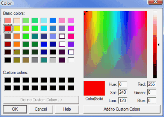 Auto Incr - This option advances the interval list box item following color selection for a particular interval. Use this feature to quickly set the colors for all items in the interval list box. Simply select the first numeric interval and begin selecting colors from the palette. Each click of the palette sets the color for the current interval and advances to the next interval. Continue until all interval colors are selected. Changing Colors on a Normal Color bar WalkthroughChanging the palette on the right side of the screen directly changes the colors used on the Color bar. To change a color on the palette, double click inside any color box to bring up a color tool. This screen has a set of basic colors, though you can use any color by selecting the color box on the right, or enter values using Hue/Saturation/Lightness or Red/Blue/Green.